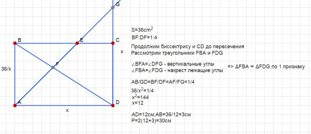 биссектриса угла прямоугольника делит его диагональ в отношении 1:4 .Найдите периметр прямоугольника , если его площадь равна 36см²