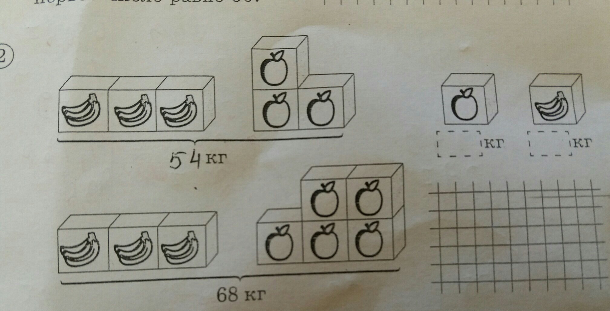 Ответ 1 кубик яблоки равен 7 кг и 1 кубик бананы равен 11 кг