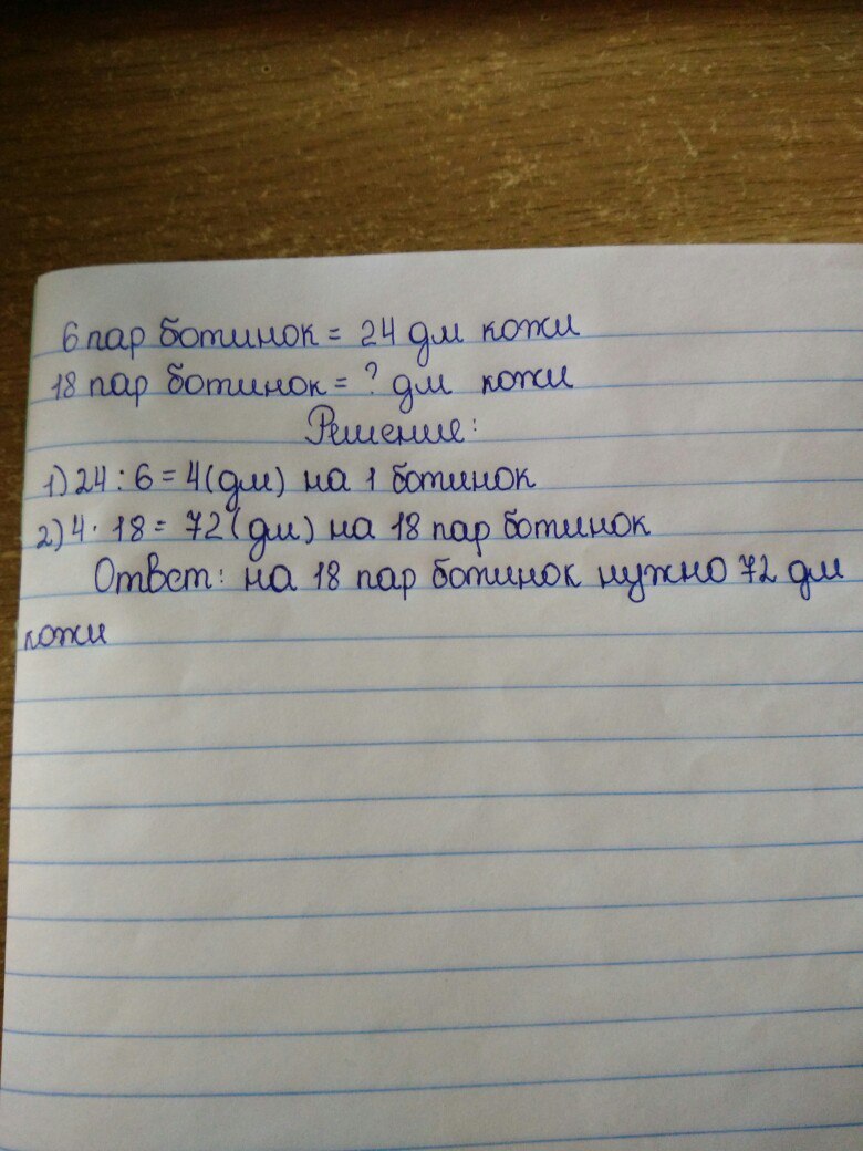 Помогите с условием.пожалусто. на 6 одинаковых пар детских ботинок расходуют 24 дм .кожи.сколько квадратных децыметров кожи нужно на 18 пар таких ботинок,?