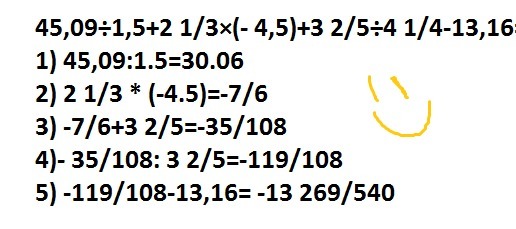 45,09÷1,5+2 1/3×(- 4,5)+3 2/5÷4 1/4-13,16=