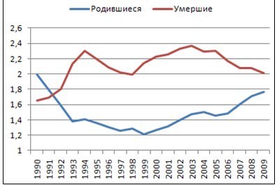 Согласно графику естественного прироста населения России за период с 1990 по 2009 годы, определите, с какого периода наблюдается спад смертности.