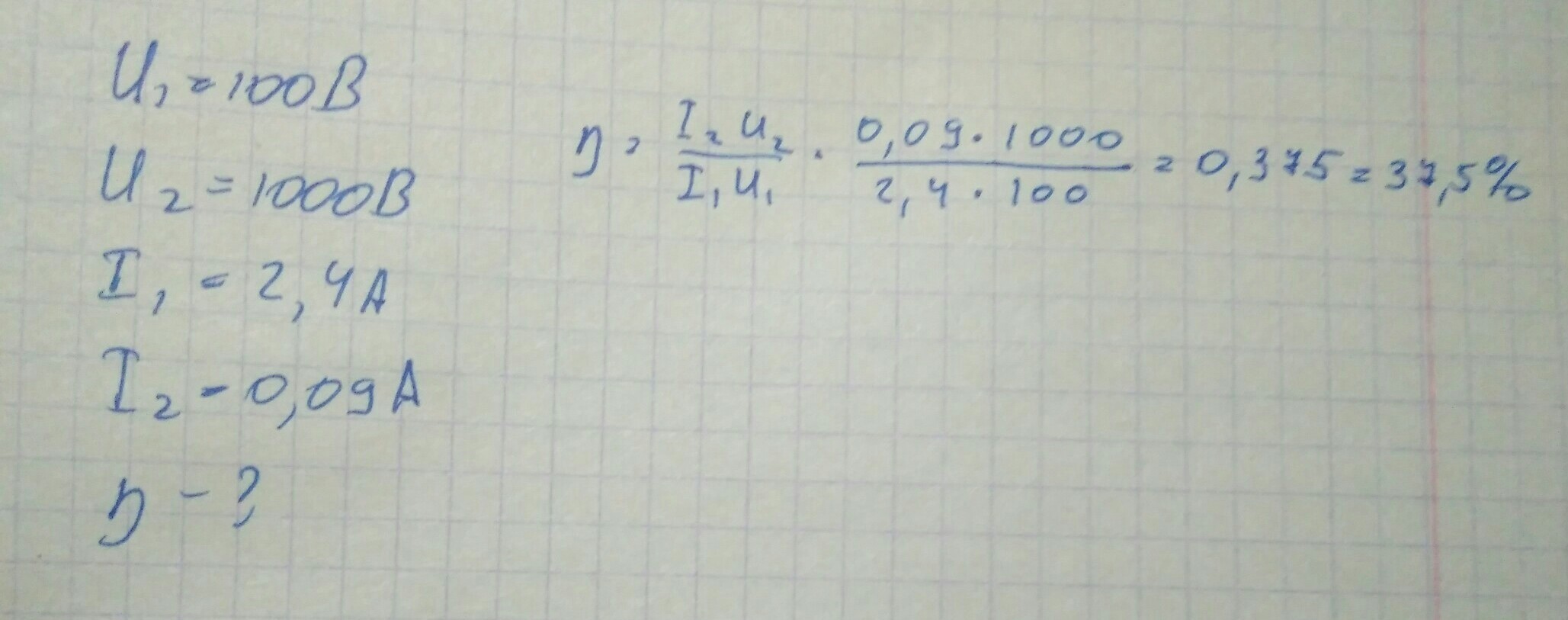 Определите КПД трансформатора если он повышает напряжение со 100В до 1000В в первичной обмотке протекает ток 2,4 ампер во вторичной 0,09 ампер