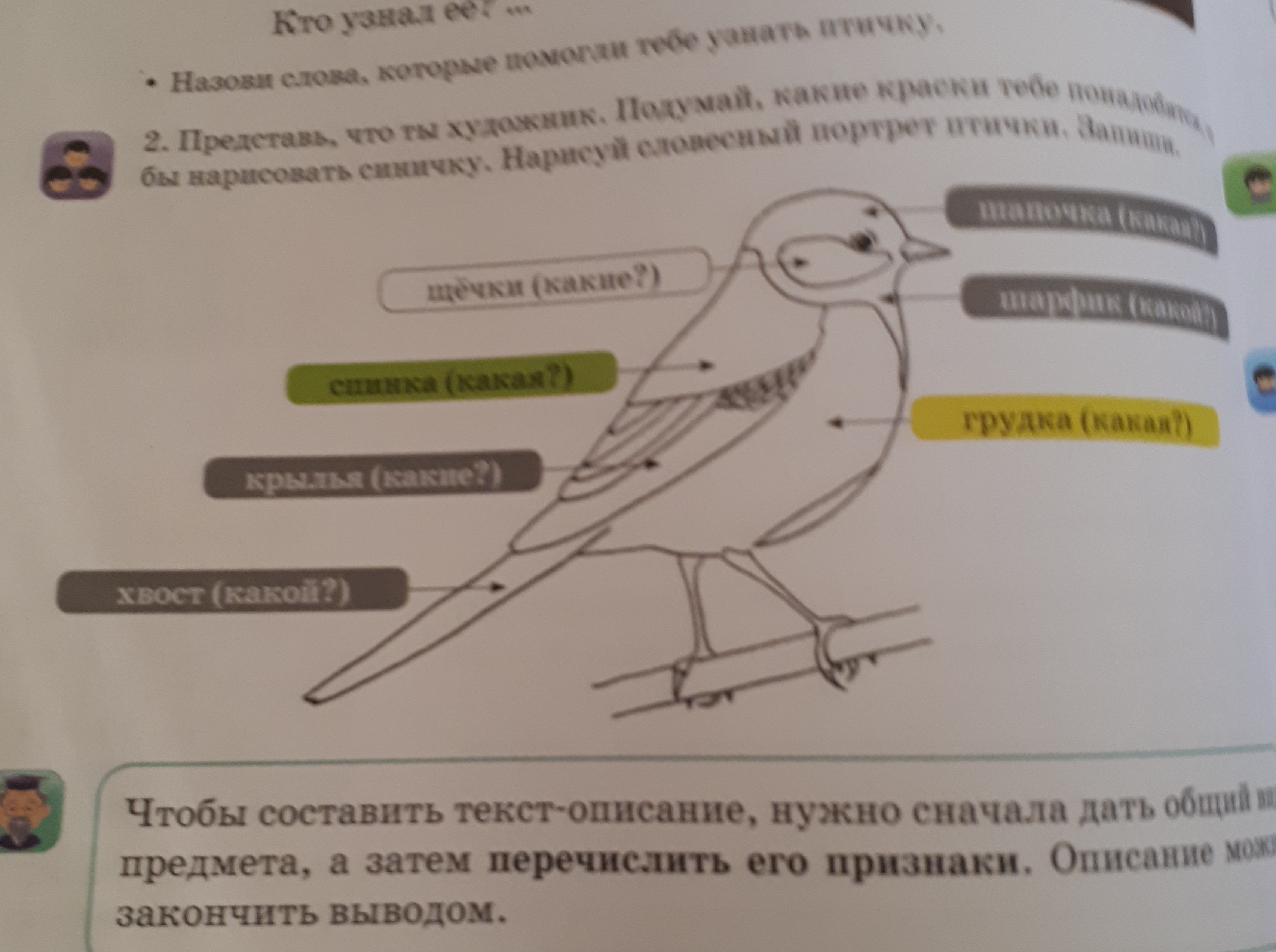 щечки какие белые спинка какая зеленая крылья какие серые хвост какой серый шапочка какая серая грудка какая жёлтая