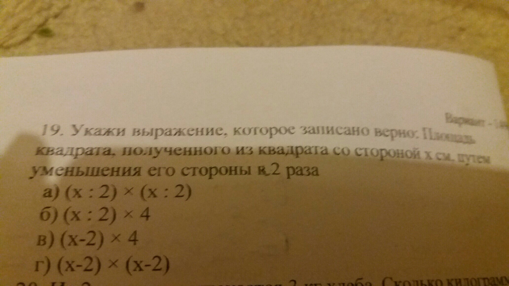 Укажи выражение,которое записано верно:Площадь квадрата,полученного из квадрата со стороной x см ,путем уменьшения его стороны в 2 раза
