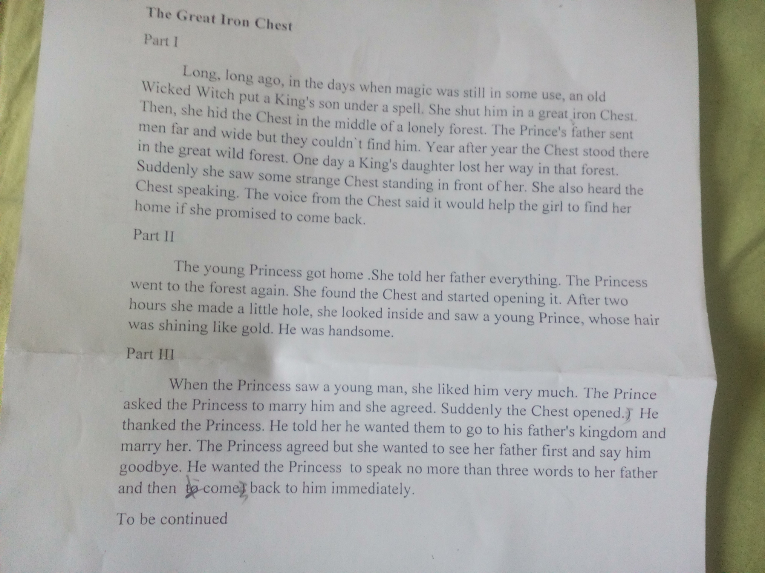 1.В далёкие,далёкие дни,когда ещё была магия,старая,злая ведьма околдавала сына короля.Она превратила его в железный сундук.Дальше она оствила его посредине пустынного леса .Отец принца отправлял толстых и широких мужчин,но они не могли найти его.Спустя год,когда сундук был оставлен посреди леса.Однажды,дочь короля заблудилась в этом лесу.Спустя некоторое время она заметила странный сундук стоящий рядом.Она услышала,что сундук говорит.Голос из сундука сказал,что он поможет ей найти путь домой,если она пообещает вернуться.