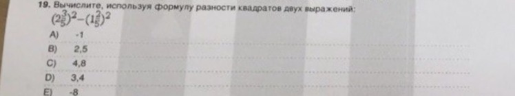 (2целых3/5)²-(1целая2/5)²=2,6²-1,4²=(2,6-1,4)(2,6+1,4)=1,2*4=4,8.