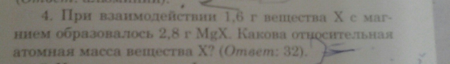 При взаимодействии 1,6 г вещества Х с магнием образовались 2,8 г МgX. Какова относительная атомная масса вещества Х