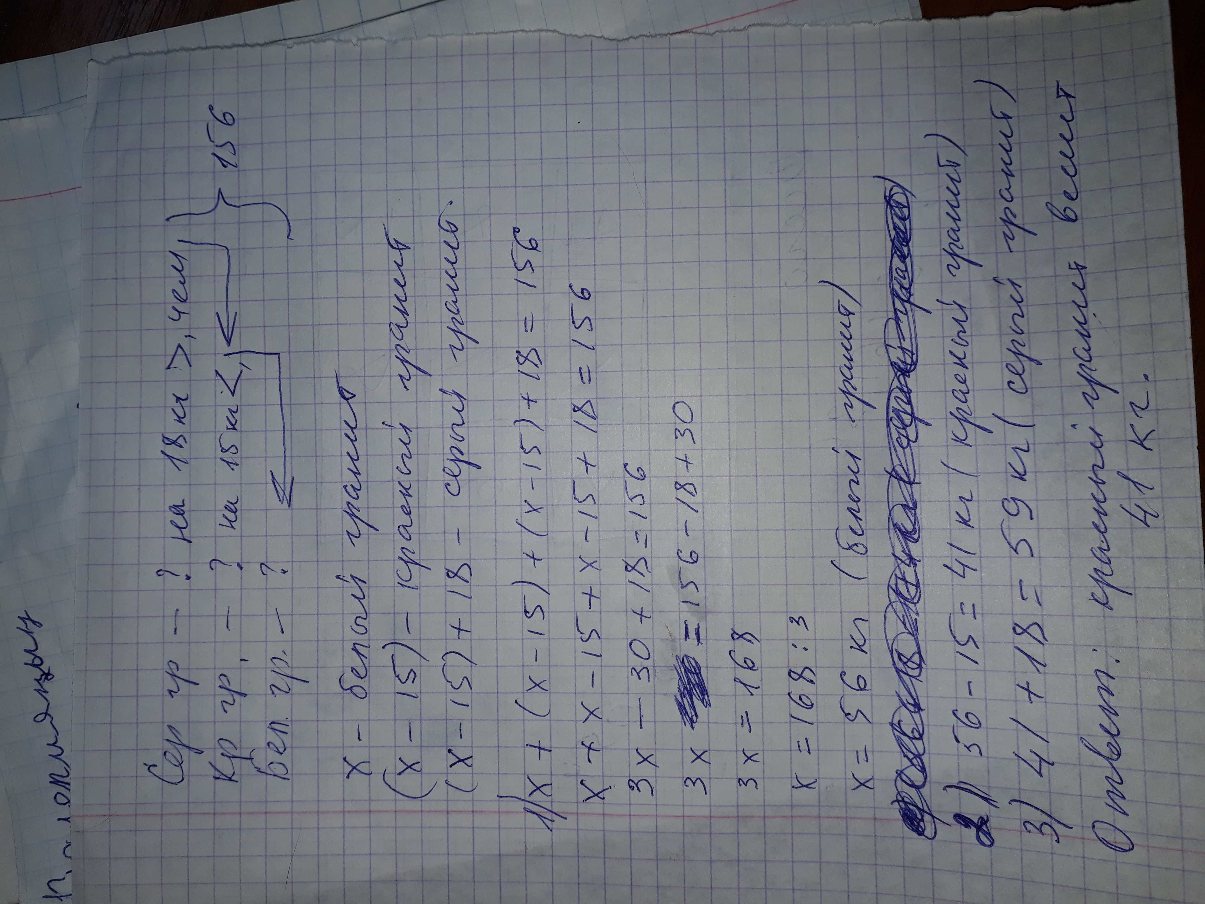 Общая масса трёх кусков гранита 156 кг.Кусок серого гранита тяжелее куска красного на 18 кг,а кусок красного гранита легче куска белого на 15 кг.Найди массу куска красного гранита.