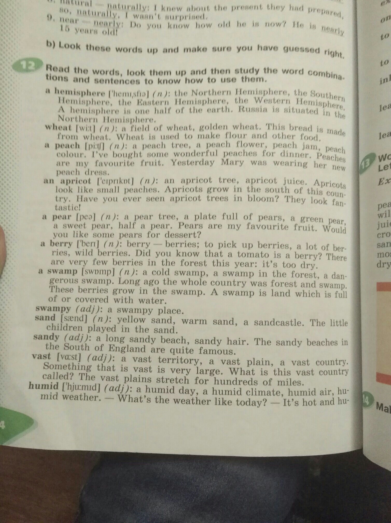 Прочитайте слова, шукайте їх, а потім вивчіть слово комбінації та пропозиції, щоб знати, як їх використовувати. півкуля, півкуля (північ): Північна півкуля, Південний південь Хем, а півкуля - одна половина землі. Русь бітується пшениці північного півкулі. Цей хліб є ма пшениця [з (n): п-поле пшениці, голд Пшениця використовується для виготовлення фло та інших продуктів з персика [pi (Il (n): персикове дерево, персикова квітка, персиковий джем, персиковий колір Я купив сом чудову Марію носив свій новий улюблений фрукт для peac абрикос ï erprikotl (n): виглядають як маленькі персики, абрикоси ростуть спробувати, коли-небудь бачили абрикос в розквіті? Tastic! Вухо дерево, тарілка повна груш, зелена горілка груша: солодка груша, половина груші, груші - мій улюблений фрунд Чи хотіли б ви трохи груш на десерт? ягода [berrl (n): ягідні ягоди, збирати ягоди , багато білих, диких Чи знали ви, що це ягода? У цьому лісі дуже багато ягід у лісі: це теж болото Iswompl холодне болото, болото в лісі, дан ці болота давно вся болота, повна або покрита водою болотистий (адж): болотисте місце пісок Ісаандля (п): жовтий пісок, теплий пісок, пісок, маленькі діти грав я n піщаний піщаний (adj): довгий піщаний пляж, пісочне волосся. Піщані пляжі на півдні Англії досить відомі. величезна величезна територія, величезна рівнина, величезна країна. Це величезне дуже велике. Яка велика країна називається? Величезна рівнина це вологий розтяг для сотень миль [hjumidl (adj): вологий день, вологий клімат, вологість середня погода. Яка погода, як сьогодні гаряча і гу?