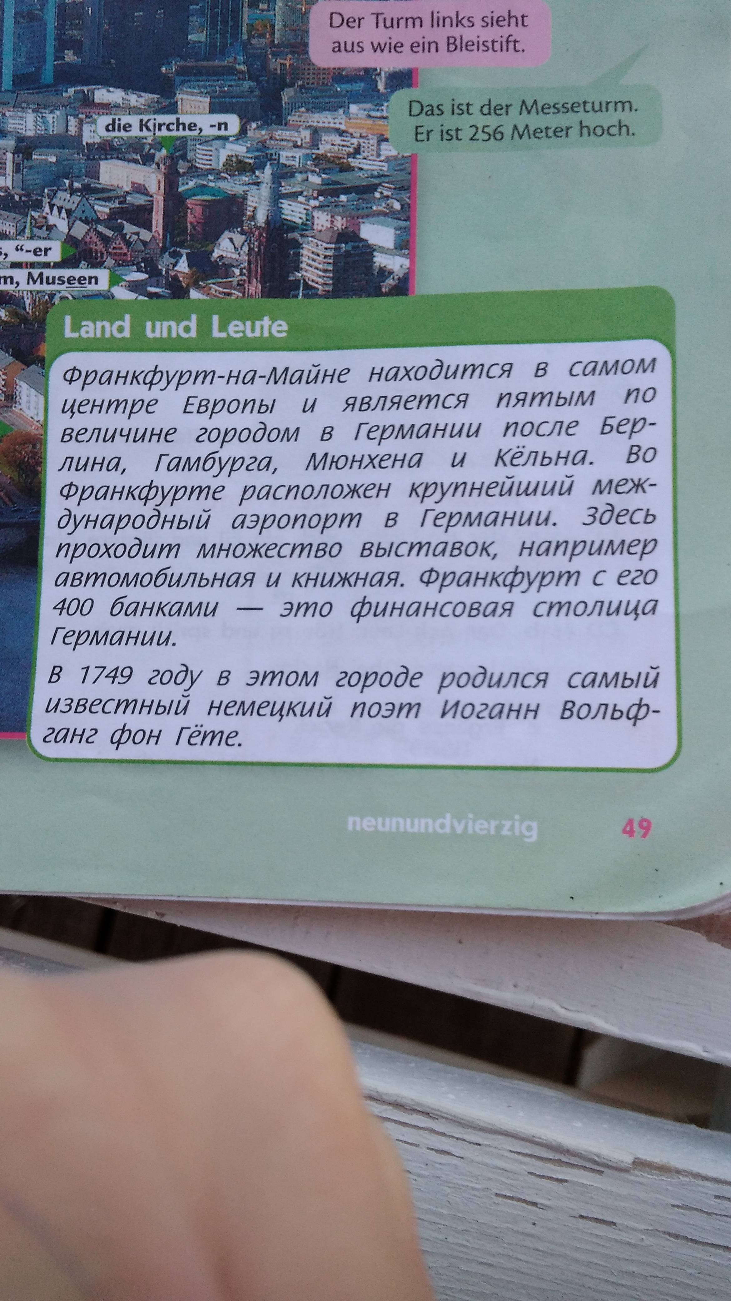 Frankfurt am Main liegt im Herzen Europas und ist nach Berlin, Hamburg, München und Köln die fünftgrößte Stadt Deutschlands. Frankfurt hat den größten internationalen Flughafen in Deutschland. Es gibt viele Ausstellungen wie Auto- und Buchausstellungen. Frankfurt mit seinen 400 Banken ist die Finanzhauptstadt Deutschlands. Im Jahr 1749 wurde in dieser Stadt Johann Wolfgang von Goethe die berühmteste deutsche Sprache geboren.