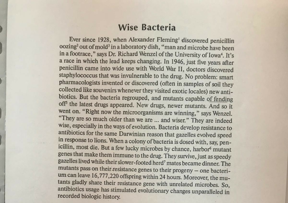 Мудрые бактерии С 1928 года, когда Александр Флеминг обнаружил, что пенициллин сочился из плесени в лабораторном блюде, «человек и микробы были в темноте», - говорит доктор Ричард Венцель из Университета Айовы. Это гонка, в которой лидер продолжает меняться. В 1946 году, всего через пять лет после того, как панициллин стал широко использоваться во время Второй мировой войны, врачи обнаружили стафилококк, который был неуязвим для этого препарата. Никаких проблем: умные фармакологи, изобретенные или обнаруженные (часто в образцах, которые они собирали как сувенир, когда они посещали экзотические локали), новые антибиотики. Но бактерии перегруппировались, и появились мутанты, способные отбить последний д-р Эс. Новые препараты, новые мутанты. И так продолжалось. «Сейчас микроорганизмы выигрывают, - говорит Венцель. «Они намного старше нас, и они мудрее. Они действительно мудры, особенно в том, что касается эволюции. Бактерии развивают устойчивость к антибиотикам по той же дарвинистской причине, что газеллы развивали скорость в ответ на то, что уолония до сих пор, скажем, иллина, большинство умирает. Но несколько удачливых микробов случайно, гавани мутану генов, которые делают их невосприимчивы к наркотикам. Так же, как и скорые лежи, в то время как их более медленные ножки со стажем стали обедом. Мутанты передают свои гены резистентности потомкам, которые один бактерий может уйти 16,777,220 потомство с 24 часами.Кроме того, мутанты с удовольствием делят свой ген устойчивости с несвязанными микробами. Таким образом, использование антибиотиков стимулировало эволюционные изменения, не имеющие аналогов в биологических