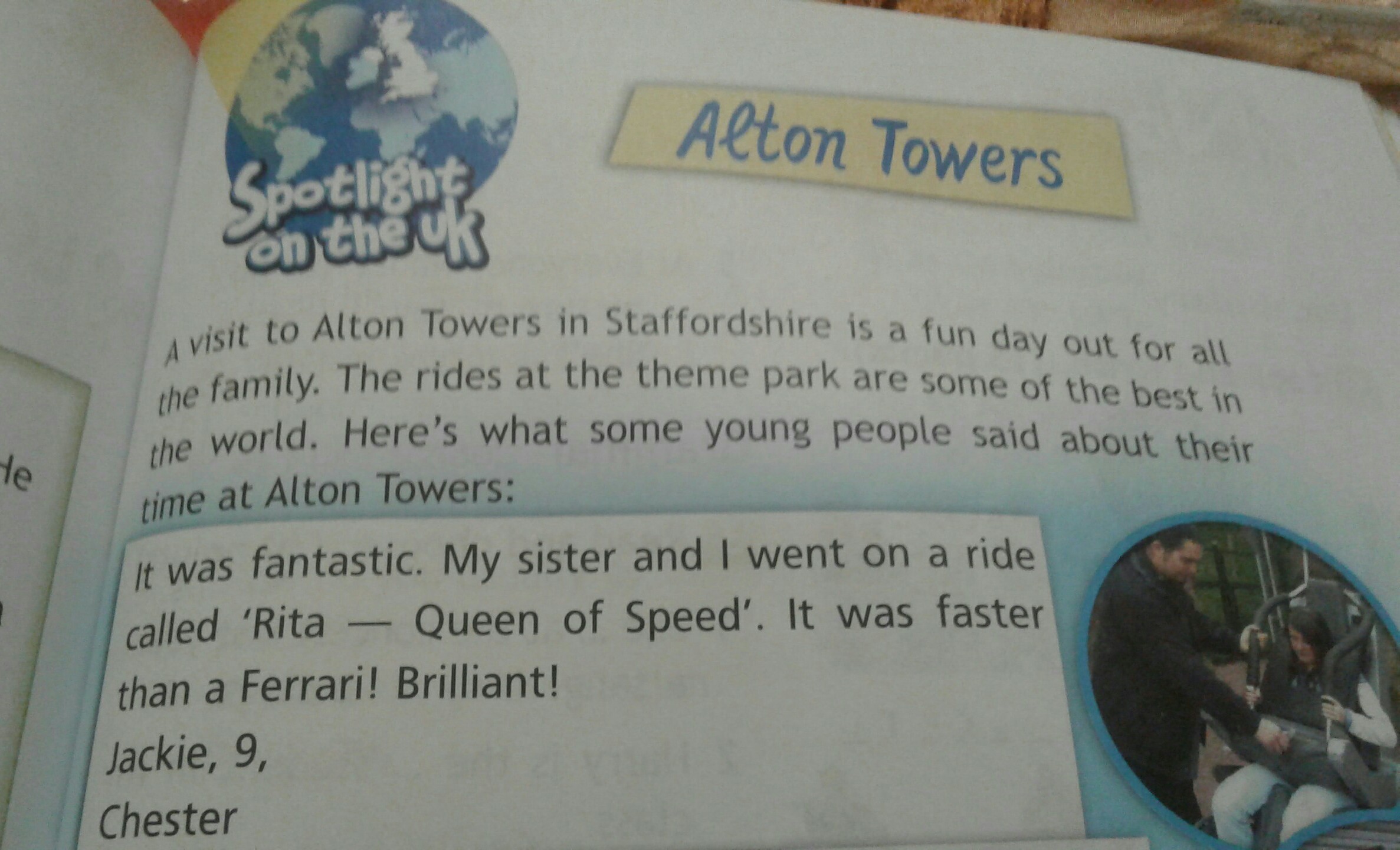 Посетить Алтон Тауэрс в Стаффордшире - это день развлечений для всей семьи. Аттракционы в тематическом парке являются одними из лучших в мире. Вот, что говорили некоторые молодые люди о времяпровождении в Алтон Тауэрас ... "Это было потрясающе. Я со своей сестрой сходили на аттракцион, который называется Рита-Королева скорости. Он был быстрее Феррари! Гениально!" - Джеки Честер, 9 лет. "Мы ждали час, чтобы покататься на аттракционе под названием"Pinball Whizzer", но это того стоило! Поездка длилась полторы минуты. Нам очень понравилось!" - Ричард и Джейми, 10 лет. Бирмингем."Мой любимый аттракцион называется "Воздух". Это летающие горки. Было довольно страшно, но я чувствовал себя как птица в небе! Я прекрасно провел время"