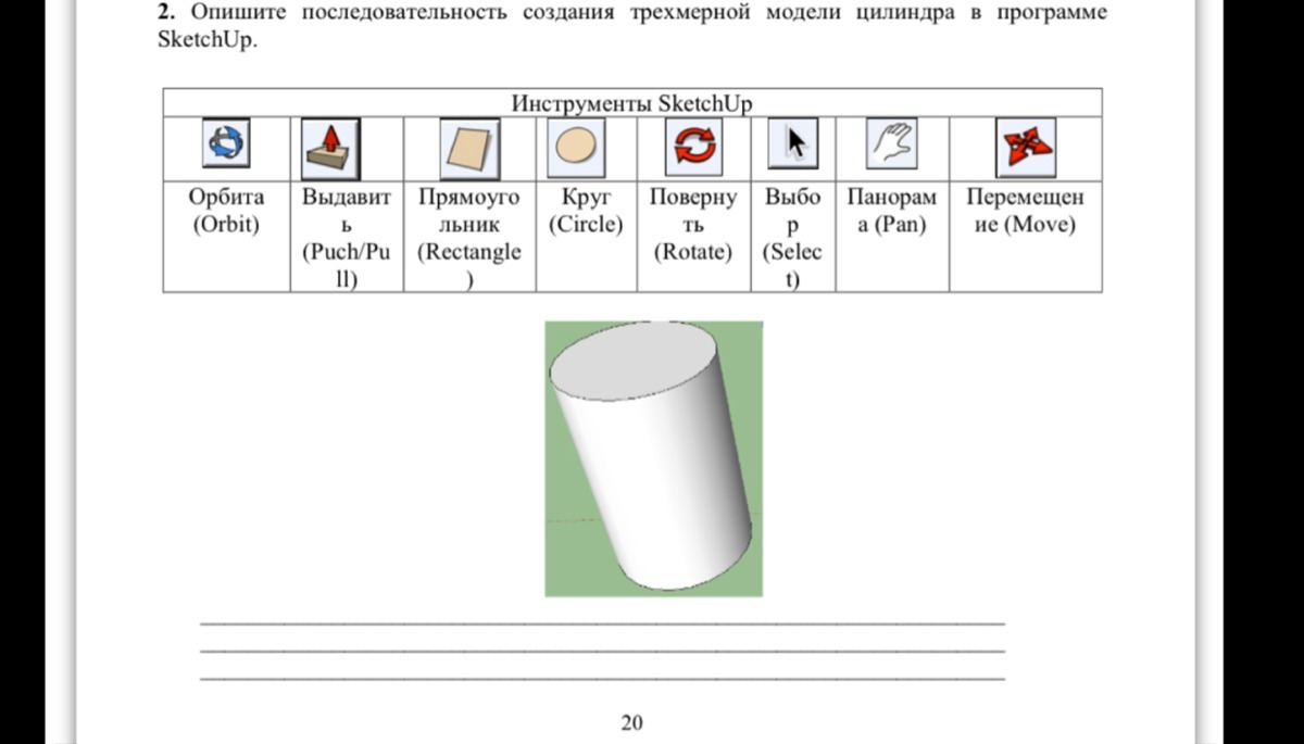 Опишите последовательность создания трехмерной модели цилиндра в программе SketchUp