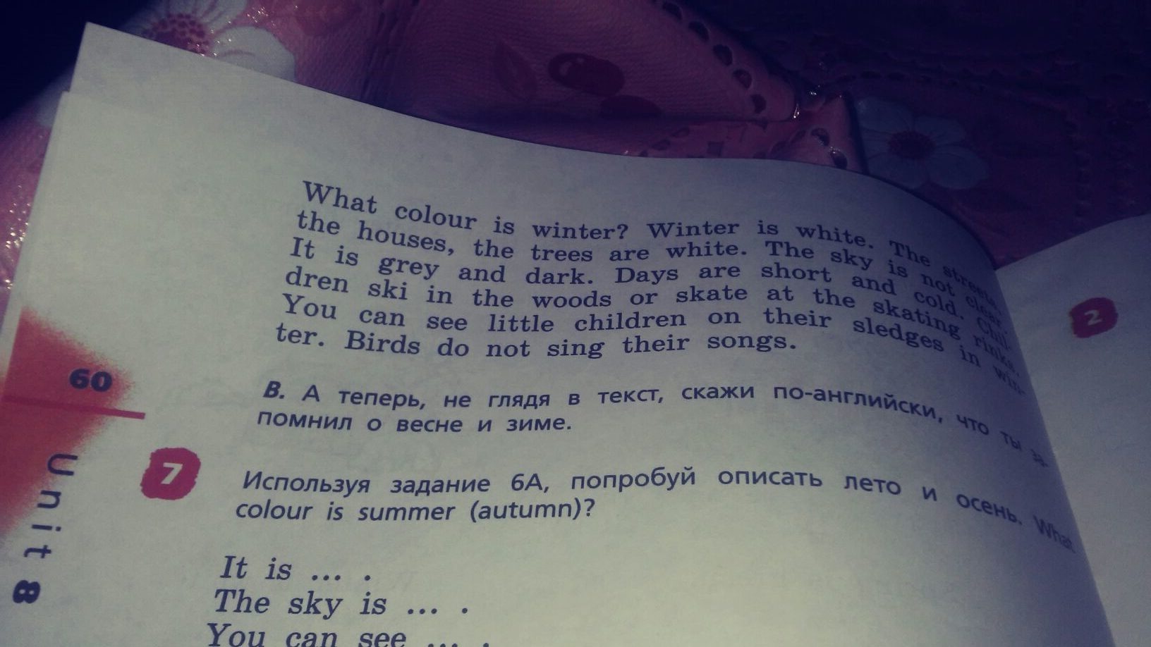 Какого цвета зима? Зима белая. Улицы, дома, деревья белые. Небо не чистое. Оно серое и темное. Дни короткие и холодные. Дети ..................... или катаются на коньках. Вы можете увидеть маленьких детей ............ зимой. Птицы не поют свои песни.