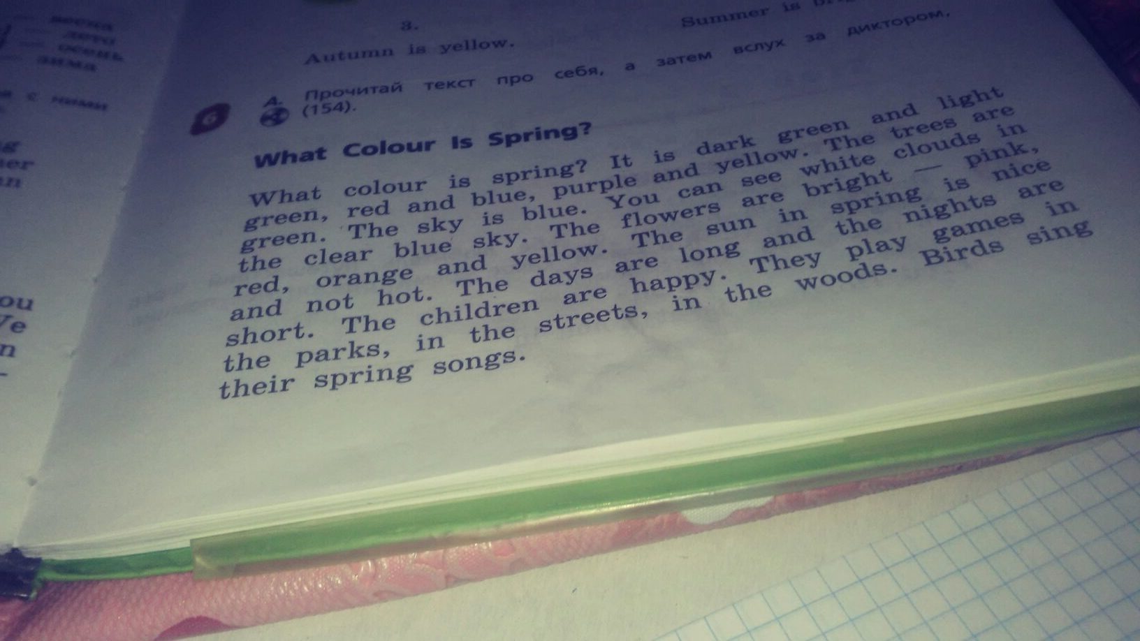 Какого цвета весна? Она темно-зеленая и светло-зеленая, красная и синяя, фиолетовая и желтая. Деревья зелёные. Небо синее. Ты можешь увидеть белые облака в чистом синем небе. Цветы яркие - розовые, красные, оранжевые и жёлтые. Солнце весной классное и не жаркое. Дни длинные и ночи короткие. Дети счастливые. Они играют в игры в парках, на улицах, в лесах. Птицы поют свои весенние песни.