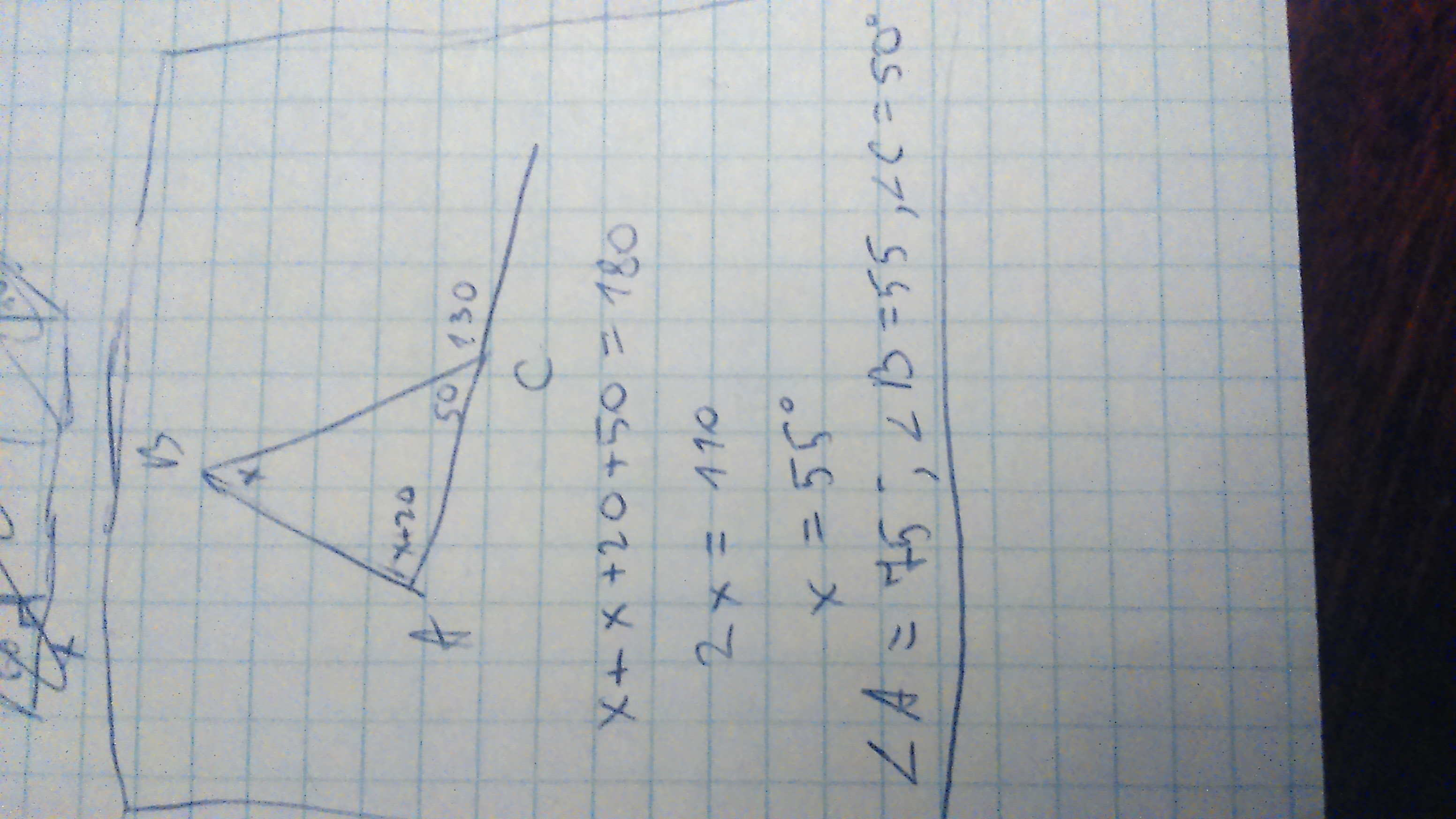 Внешний угол при вершине С треугольника АВС равен 130 градусов. Найти внутренние углы треугольника если угол при вершине А на 20 градусов больше угла при вершине В.