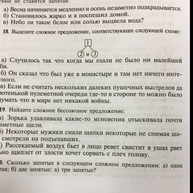 18. Указанной схеме соответствует предложение б) Он сказал, что был уже в монастыре, и там нет ничего хорошего...19. Бессоюзное сложное предложение б) Некоторые мужики сняли шапки, некоторые, не снимая шапок, смотрели на подъехавших.