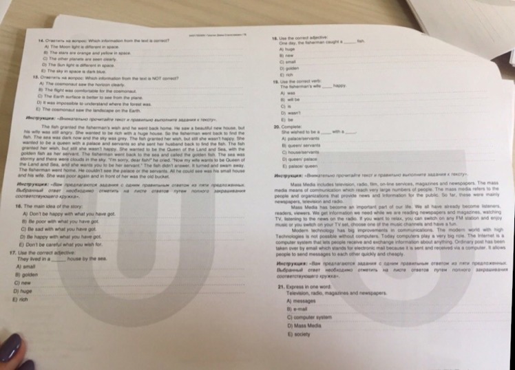 А расскажите, что у вас там происходит? Просто интересно. У Вас там большая стопка скрепленных листов с заданиями. Вы фоткаете по 1 странице уже полдня и выкладываете. Вы что-то сдаёте? Какой-то экзамен на знание языка? Просто хочется знать в чём я принимала участие?)