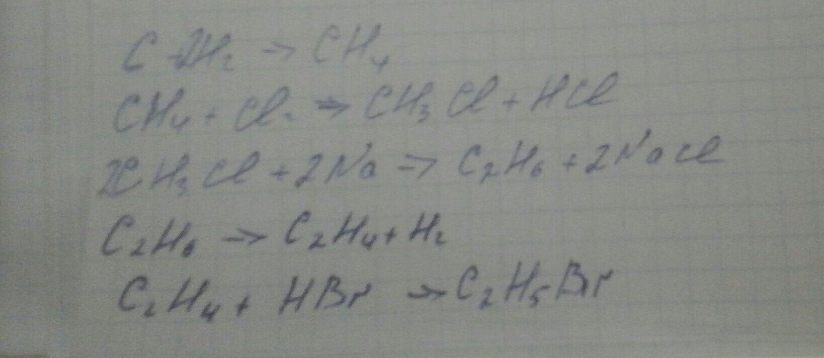 C(вугілля)--(+H2)---A---(Cl2*hv)---Б--(+Na)--В--(-H2)--Г--(+HBr)---Д
