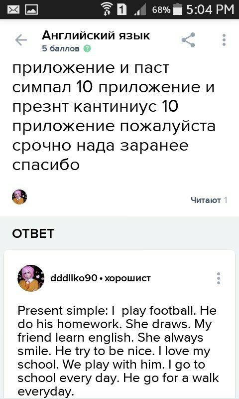 Я играю в футбол. Он делает домашнюю работу. Она рисует. Мой друг изучает английский язык. Она всегда улыбается. Она пытается быть хороши. Я люблю мою школу. Мы играем с ним. Я хожу в школу каждый день. Он гуляет каждый день.