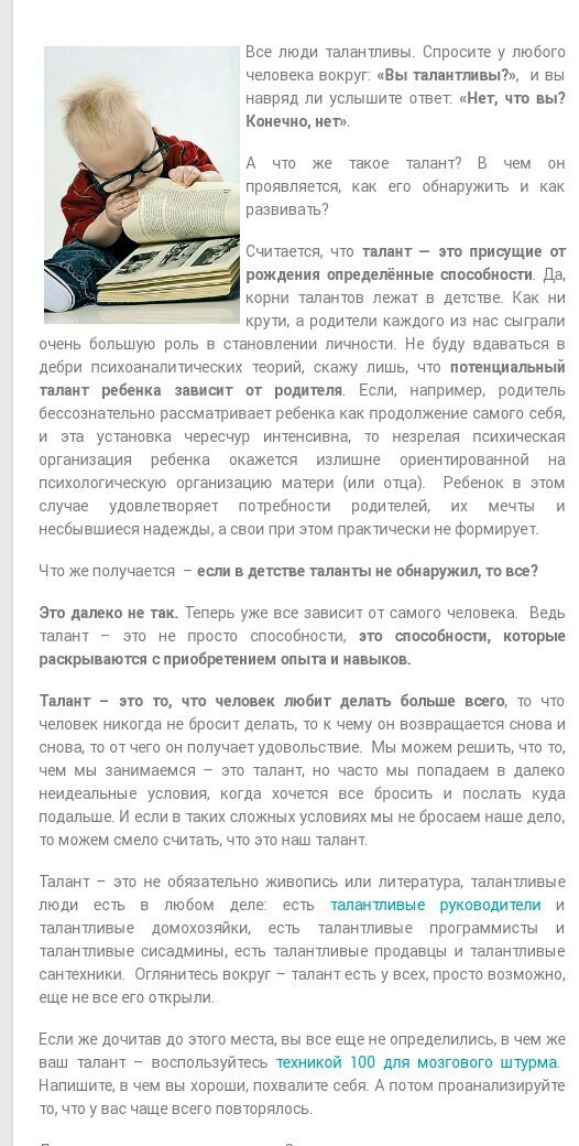 Талант — выдающиеся способности, которые открываются с приобретением опыта, формируя недоступный большинству людей навык, позволяющий добиться наибольшего успеха в области его проявления.