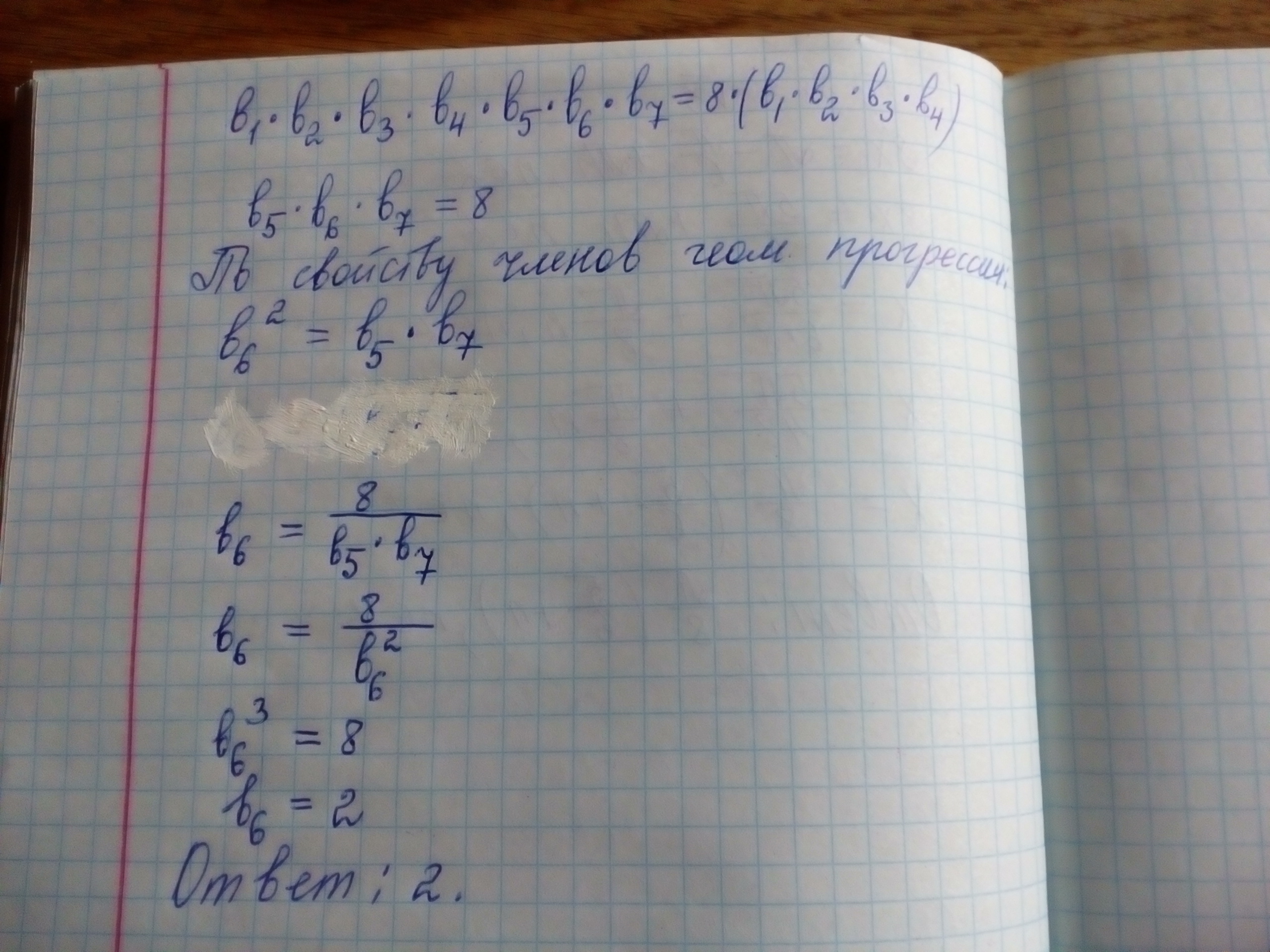 Дано:b1 * b2 * b3 * b4 * b5 * b6 * b7 = b1 * b2 * b3 * b4 * 8Свойство геометрической прогрессии:bn = b1 * q ^ (n - 1)Подставляем св-во:b5 * b6 * b7 = 8, откуда b1 * b1 * b1 * q ^ 4 * q ^ 5 * q ^ 6 = 8.b1 * q ^ 5 = 8 / (b1 ^ 2 * q ^ 10)b1 * q ^ 5 = 8 / ((b1 * q ^ 5) ^ 2)b1 * q ^ 5 = 2