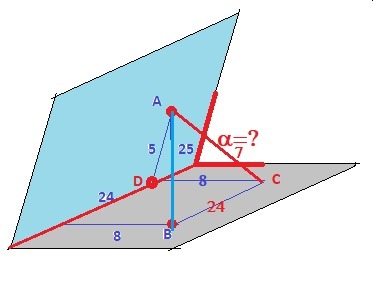 Точки А и В , лежащие на разных гранях двуграннного угла , удалены от его угла на 5см и 8см соответственно . Найти величину двугранного угла , если расстояние между данными точками = 25см , а между их проекциями на ребро угла = 24см .
