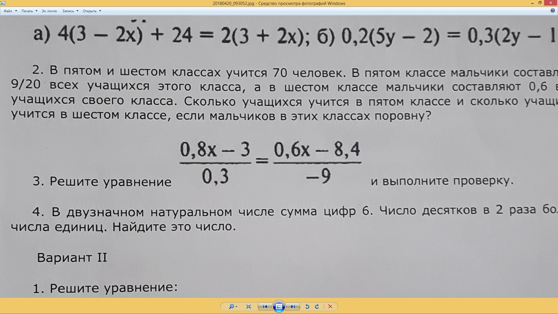 - 9(0.8x - 3) = 0.3(0.6x - 8.4) \  - 7.2x + 27 = 0.18x - 2.52 \ 29.52 = 7.38x \ x =  frac{29.52}{7.38}  = 4