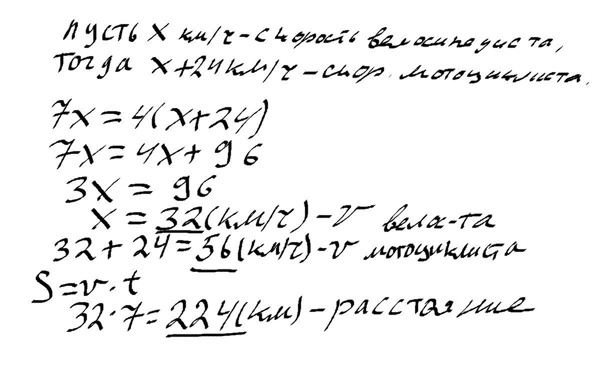 Расстояние между городами мотоциклист проехал за 4 часа а велосипедист проехал за 7 часов. Скорость велосипедиста на 24 км/ч меньше скорости мотоциклиста. Вычисли скорости велосипедиста и мотоциклиста и расстояние между городами.