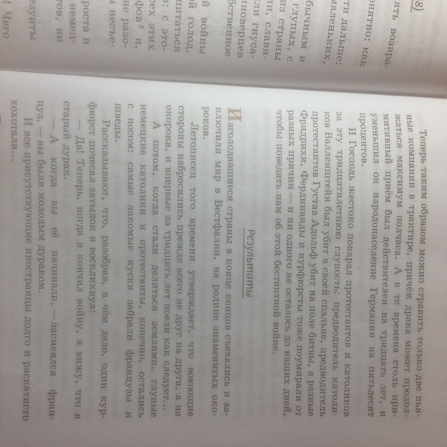 Страны оголодали и потому решили заключить мир между собой. Для этого они съехались в Вестфалии, славившейся знаменитыми окороками.Летописец, описывающий события, утверждал, что участники переговоров, не обращая внимания друг на друга, накинулись сразу на окорока, желая наесться за все тридцать голодных лет.После же, при разделе земель, немецких католиков и протестантов обошли в выгоде французы и шведы.Увидев это, один курфюрст с досадой восклинул:- Да! Только закончив войну я увидел, какой же я старый дурак.- А когда вы её начинали, вы, вероятно, были молодым дураком, - пошутил француз.Это развеселило присутствующих и они громко и долго смеялись над шуткой.