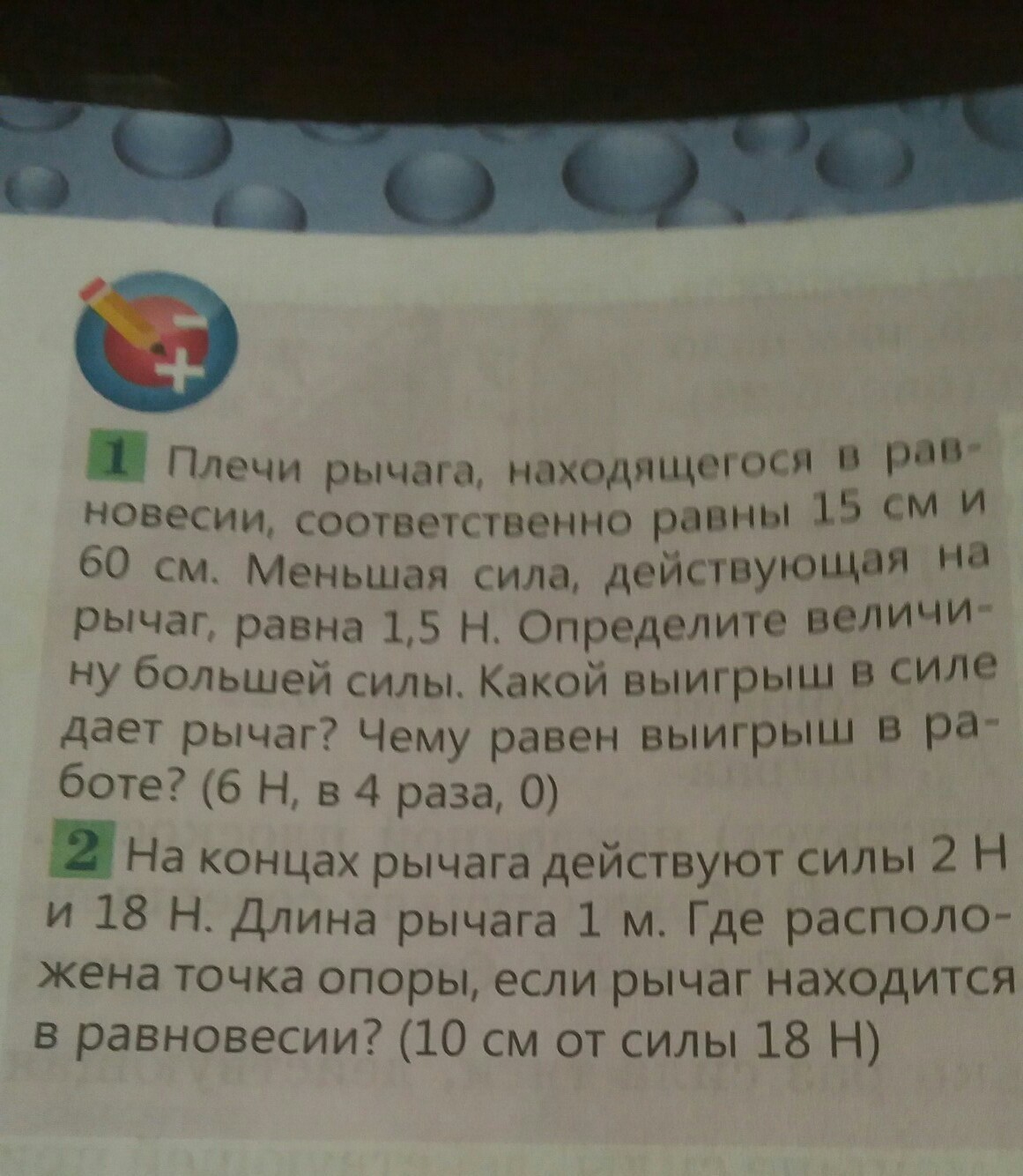 Рычаг в равновесии, значит F1/F2 = l2/l1, то есть F1/1,5 Н = 60 см/15 см(сантиметры можно не переводить в метры, так как они в любом случае сократятся), значит F1 = (1,5 × 60)/15 = 6 Н. Выигрыш силы равен 4, прикалывается сила в 1,5 Н, а действует сила в 6 Н.
