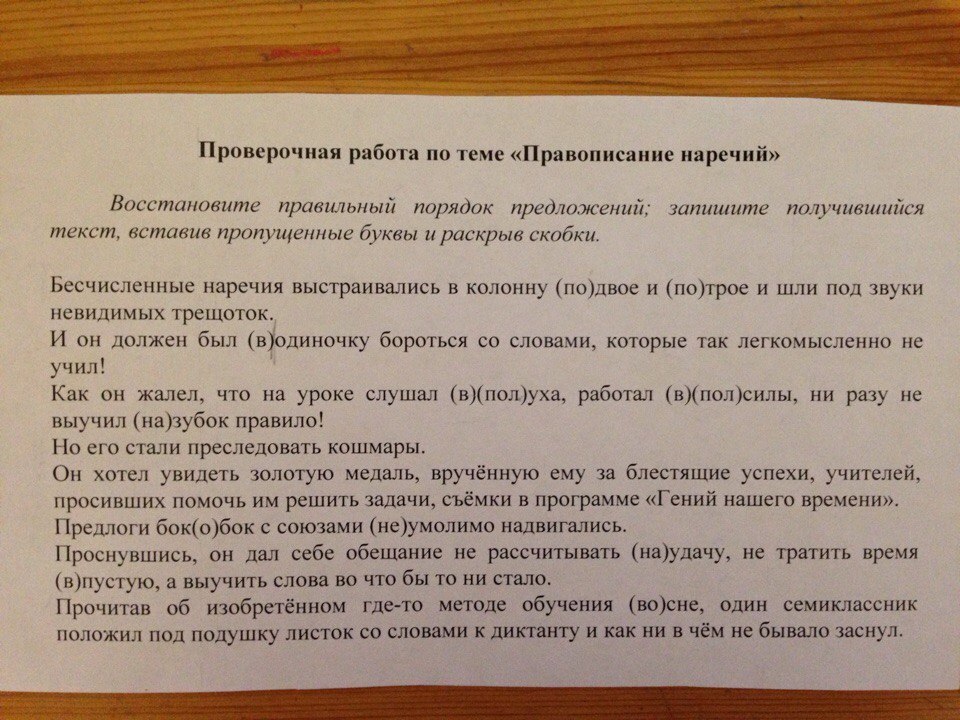 Прочитав об изобретённом где-то методе обучения во сне , один семиклассник положил под подушку листок со словами к диктанту и как ни в чём не бывало заснул.Он хотел увидеть золотую медаль, врученную ему за блестящие успехи,учителей,просивших помочь им решить задачи,съёмки а программе <<Гений нашего времени>> Но его стали преследовать кошмары. Бесчисленные наречия выстраивались в колонну по двое и по трое и шли под звуки невидимых трещеток. И он должен был в одиночку бороться со словами,которые он так легкомысленно не учил! Как он жалел,что на уроке слушал в пол уха,работал в пол силы, не разу не выучил на зубок правило.