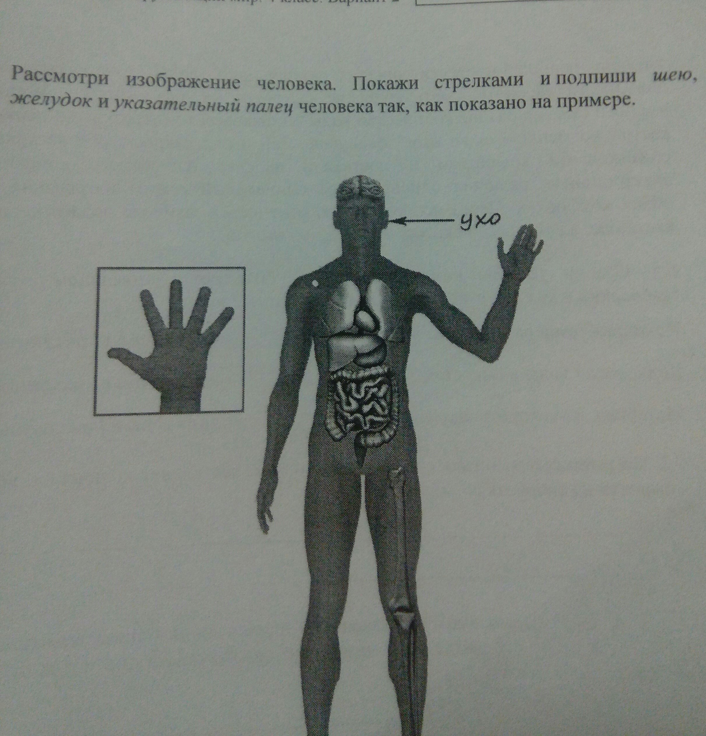 сделай стрелку как на рисунке и направь ее на шею,указательный палец 4,если считать от маленького пальца, а желудок находится над толстой кишкой,справа