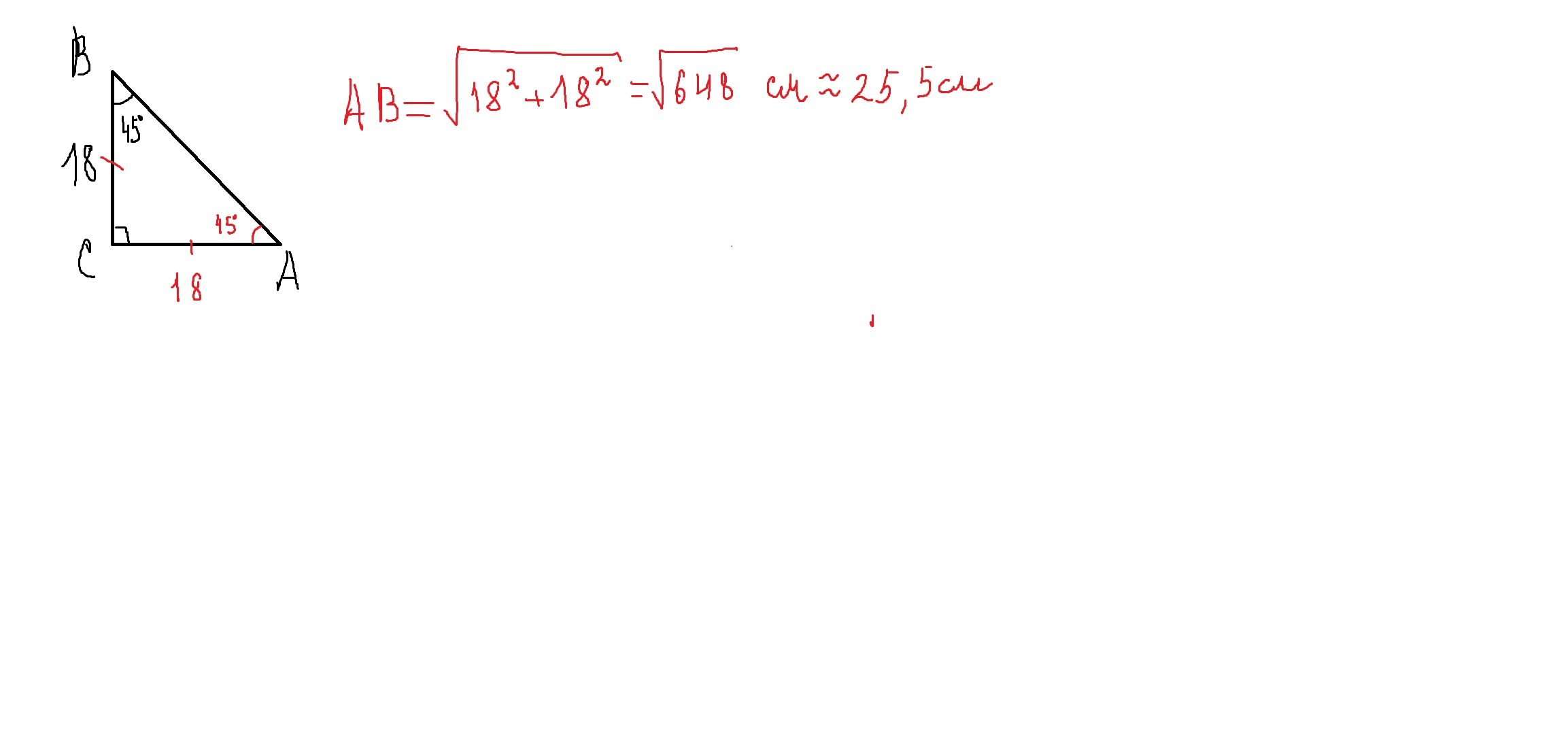 ∠В=45° тогда ∠А=180°-90°-45°=45°.Значит ΔАВС равнобедренный и сторона АС=18 см. по т.Пифагора найдем гипотенузу АВ