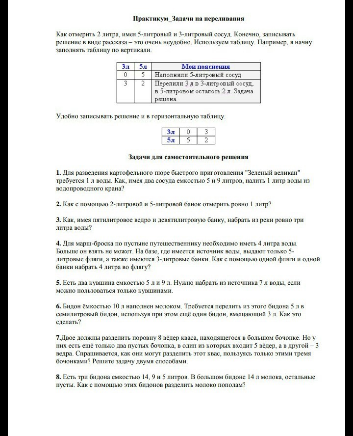 6)|1-й сосуд (10 л) | 10 | 3 | 3 | 6 | 6 | 9 | 9 | 2 | 2