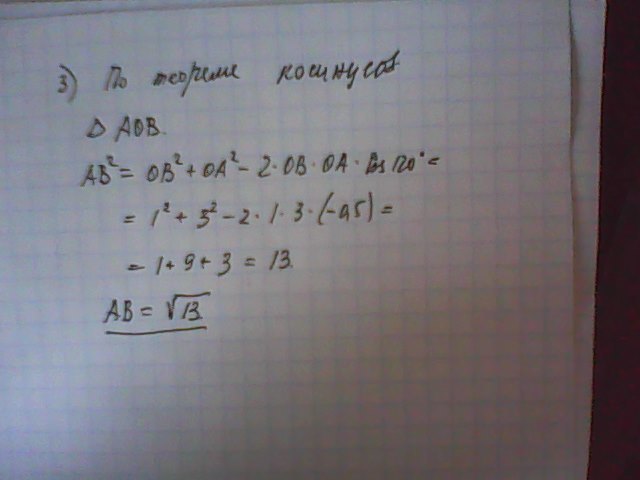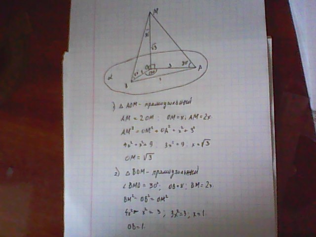 Из точки М опущен перпендикуляр МО на плоскость α. Точки А и В принадлежат плоскости α, ∠MAO=30°, ∠MBO=60°, ∠AOB=120°, AO = 3. Найдите расстояние между точками А и В.