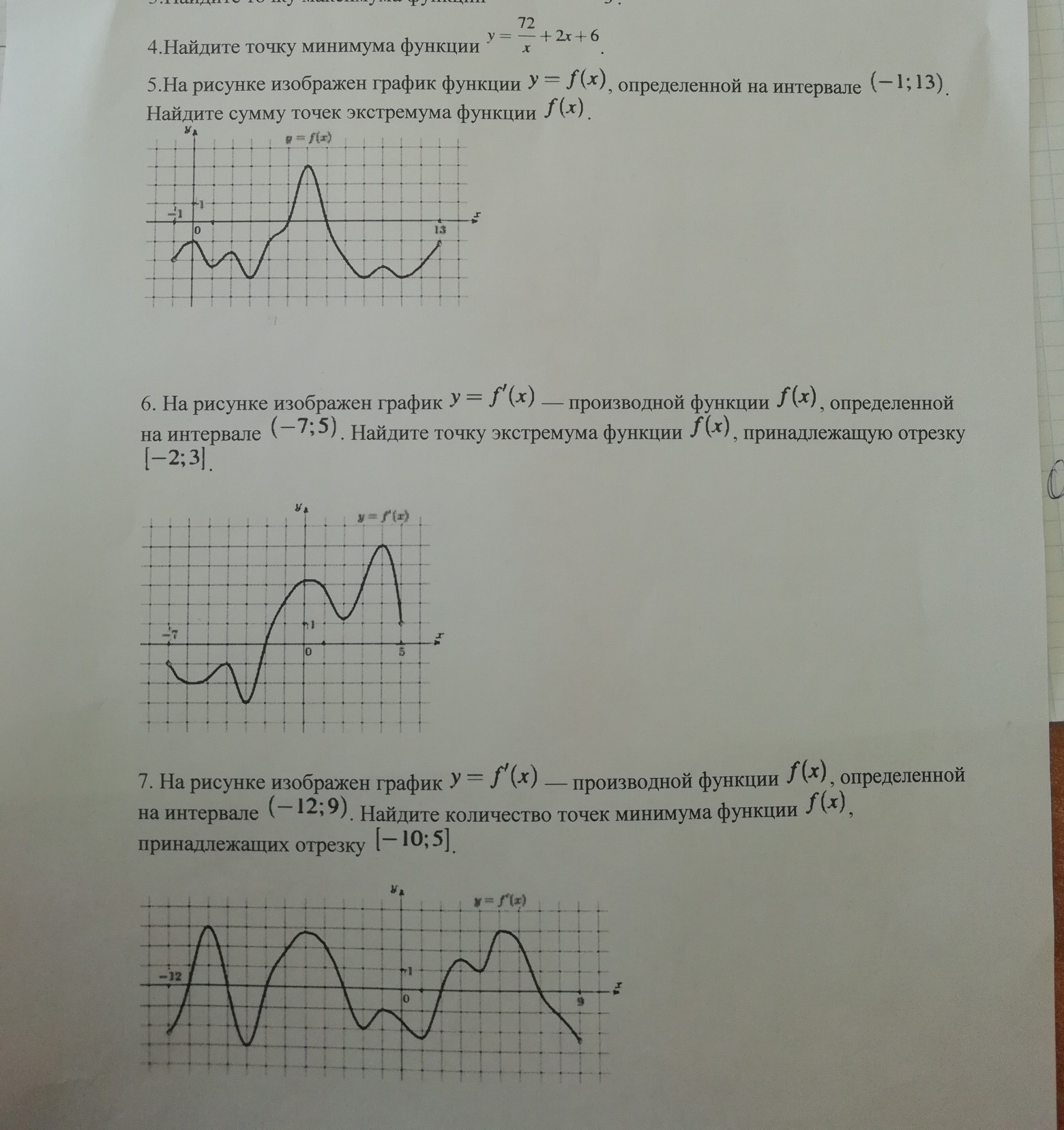 7) точки экстремума это те где график производной пересекает ось ох. это точки : -11, -9, -7, -3, 2, 7. Это минимумы и максимумы. нам надо минимумы. это те точки, где знак производной меняется с - на +.Это точки -11, -7, 2. Т.е. 3 точки.