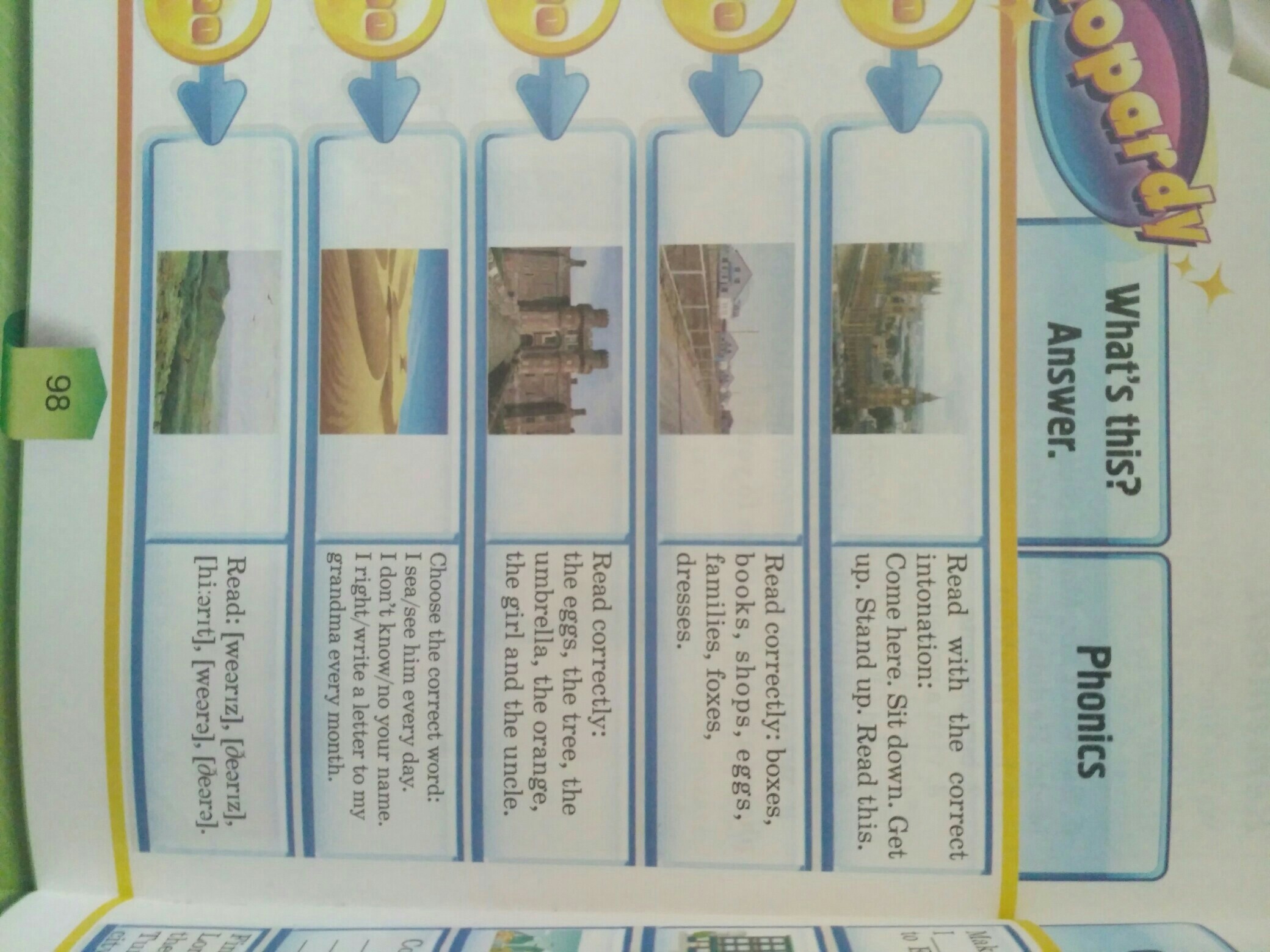 Ответ. Читайте с правильной интонацией: Идите сюда. Сядьте. Вставай. Встаньте. Прочитай это. Читайте правильно: коробки, книги, магазины, яйца, семьи, лисы, платья. Читайте правильно: яйца, дерево, зонтик, апельсин, девочка и дядя. Выберите правильное слово: я море / вижу его каждый день. Я не знаю твоего имени. Я правильно / пишу письмо моей бабушке каждый месяц. Читайте: weariz], [дорогой], [привет orit], [weara], [de ral.
