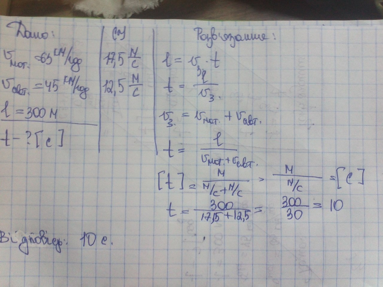 (Додаэмо швидкості, тому що мотоцикл та автомобілі рухаються назустріч)