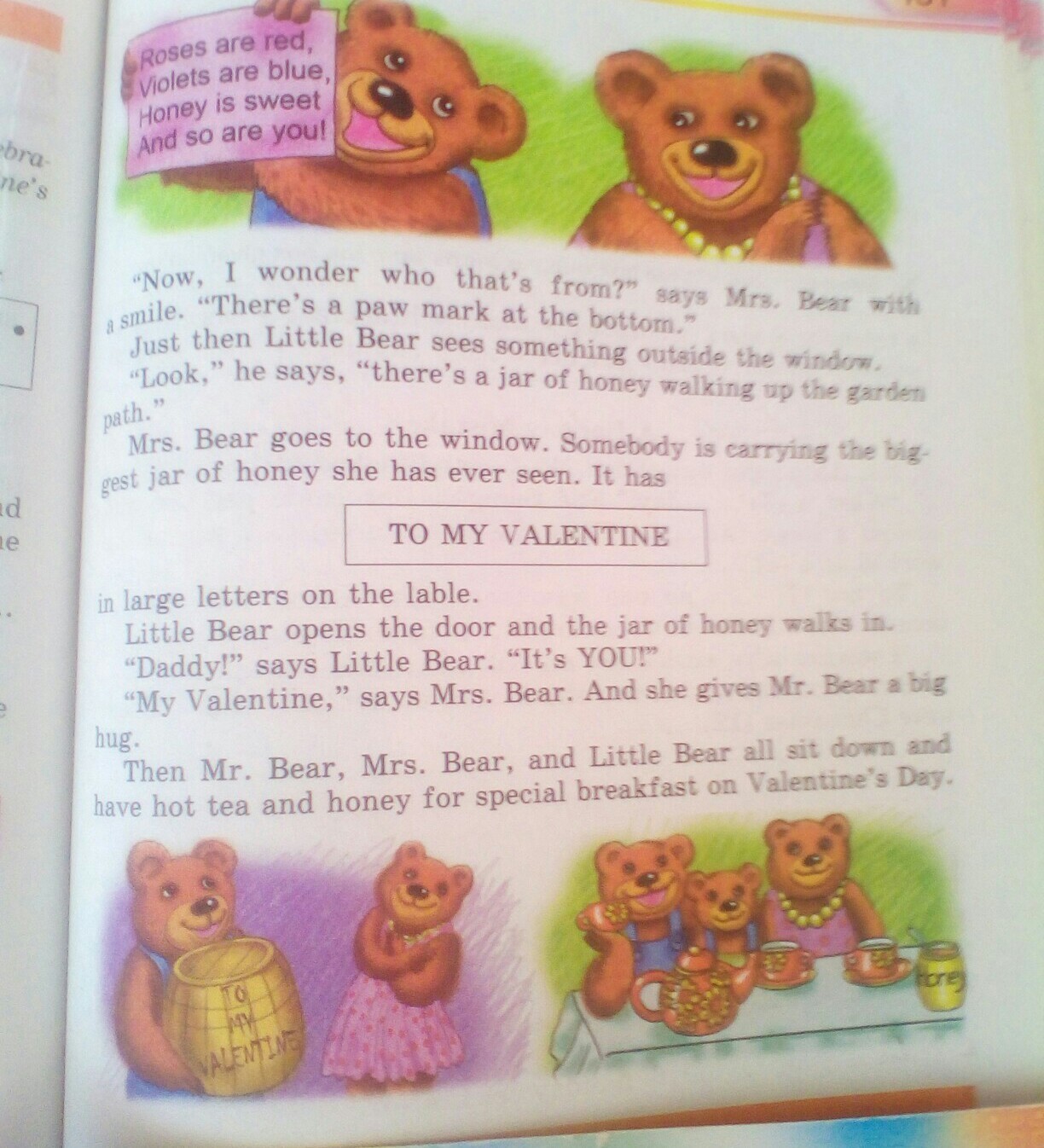 Теперь. Интересно, кто это? »« Миссис Медведь с милей ». Внизу есть лапка.« Тогда Маленький Медведь видит что-то вне ветренного взгляда, - говорит он, - есть мешок с медом, идущий позади «. которую она когда-либо видела. Г-жа Медведь подошла к окну. Кто-то, несущий би, в МОЮ ВАЛЕНТИНЬ большими буквами на листе. Маленький Медведь открывает дверь, и кувшин с медом васит меня, папа! »- говорит Маленький Медведь.« Это YOUT «Мой Валентин», - говорит миссис Медведь. И она дает мистеру Медведею большой юг. Затем мистер Медведь, миссис Медведь и Маленький Медведь все садятся и жарят чай и мед на специальный завтрак в День святого Валентина