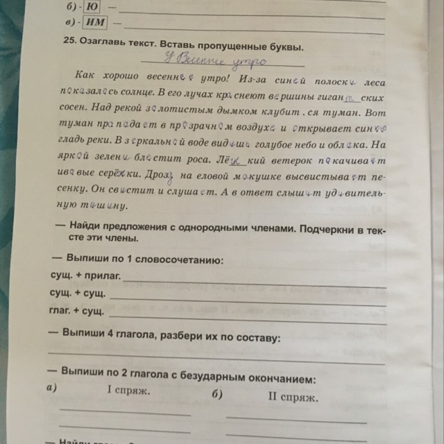 предложение с однородными членами это -Вот туман пропадает в прозрачном воздухе и открывает синюю гладь реки. однородные сказуемые надо подчеркнуть двумя чертами сказуемые-пропадает, открывает.