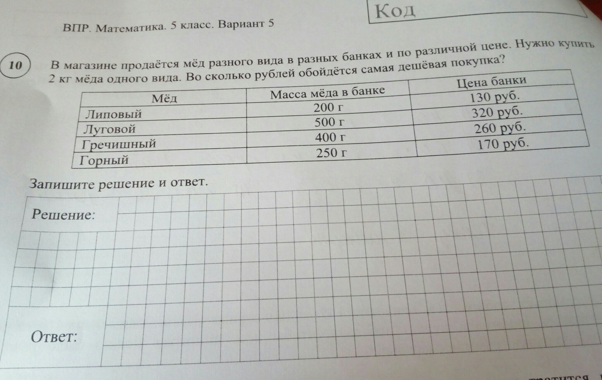 В магазине продается мед разного вида в разных банках и по различной цене. Нужно купить 2 кг меда одного вида . Во сколько рублей обойдется самая дешевая покупка???