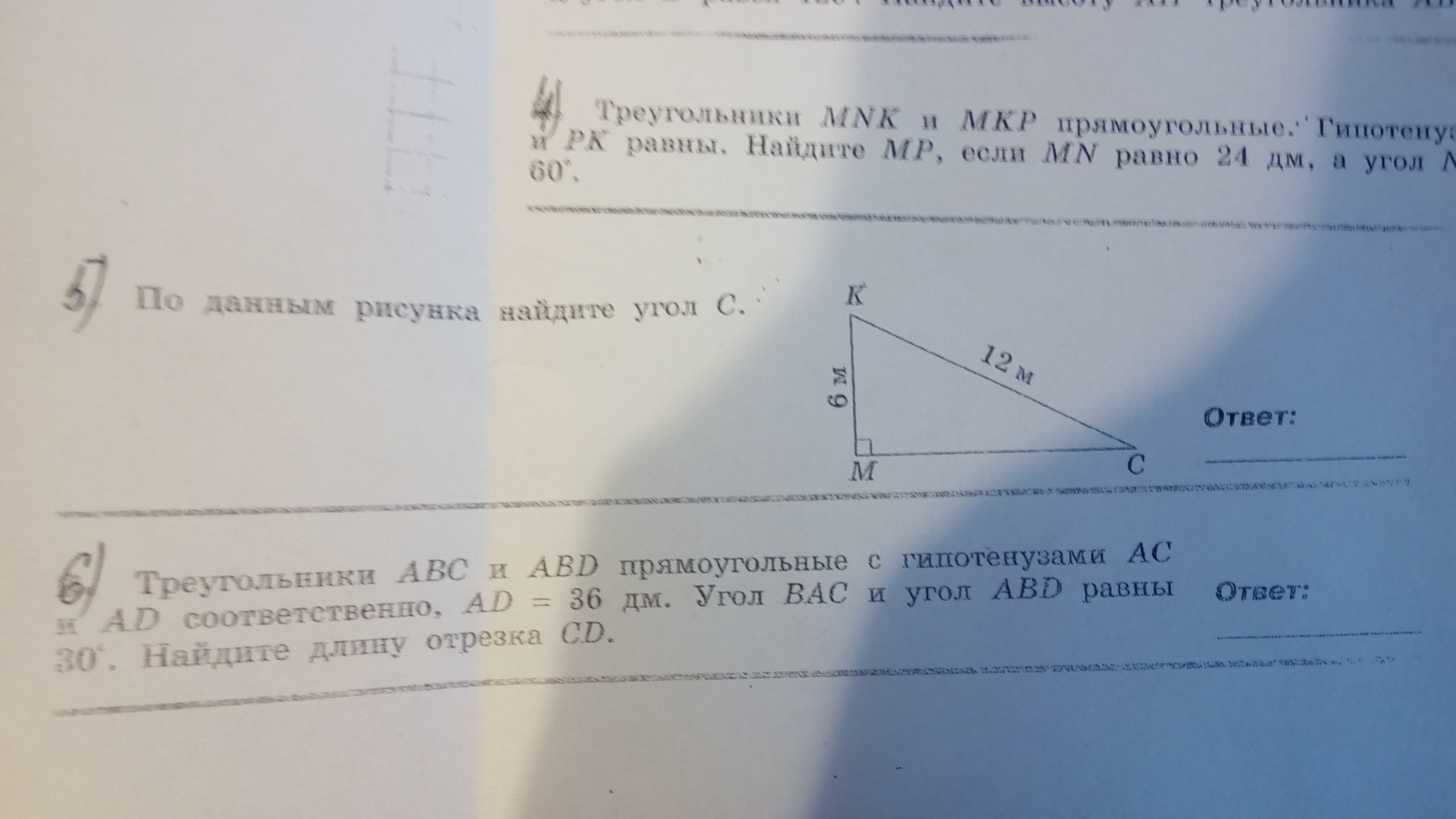 Угол, лежащий против угла 30 градусов равен половине гипотенузы. KM = 1/2 KC, значит лежит против угла 30 градуов. Угол С =30 градусов