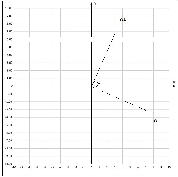 Точка А (7; −3) переходит в точку А1 при повороте на 90° против часовой стрелки вокруг начала координат. Укажите координаты точки А1.