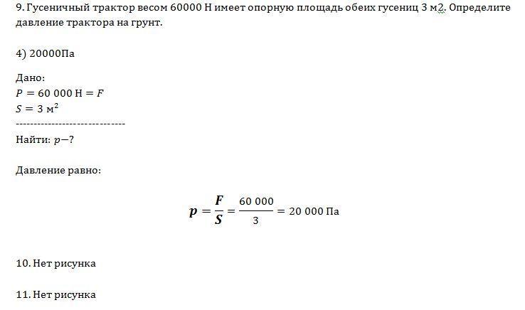 9. Гусеничный трактор весом 60000 Н имеет опорную площадь обеих гусениц 3 м2. Определите давление трактора на грунт.