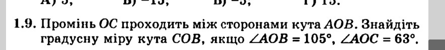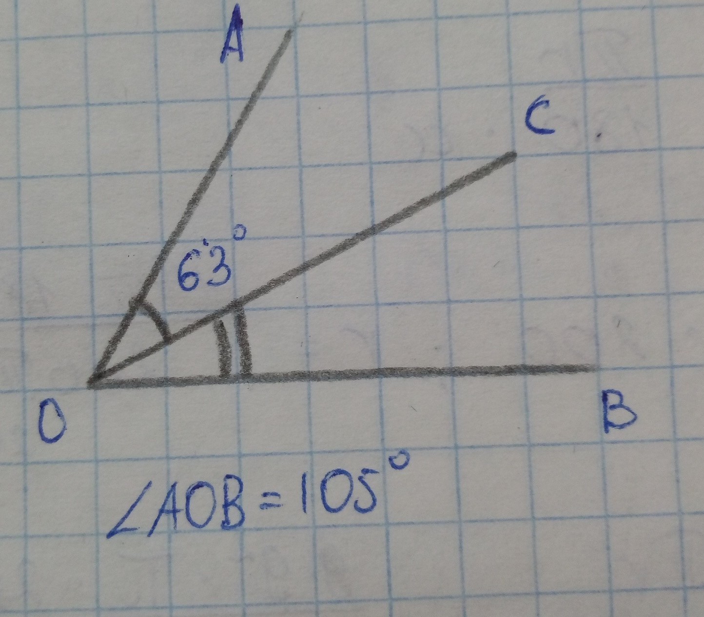 Угол СОВ = угол АОВ - угол АОС = 105° - 63° = 42°