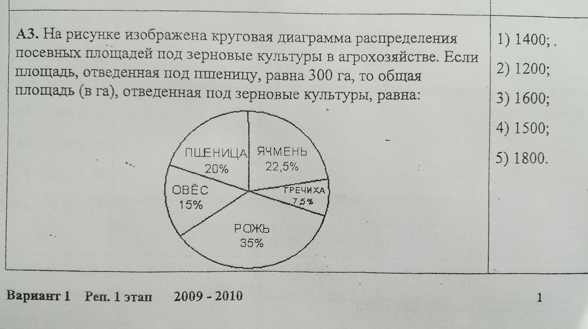 На рисунке изображена круговая диаграмма распределение посевных площадей под зерновые культуры в агрохозяйство если площадь отведена под пшеницей равна 300 гектаров общая площадь в гектарах отведена под зерновые культуры равна