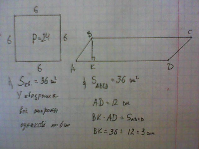 Паралелограм має таку ж саму площу що й квадрат із периметром 24 см . Сторона паралелограма дорівнює 12 см . Знайдіть висоту проведену до цієї сторони. З малюнком пожалуста!!!