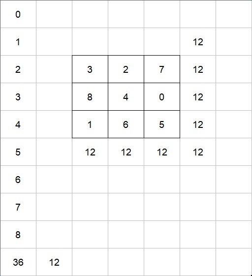 Ну, а дальше квадрат заполняется без всяких вопросов- на каждом шаге в одной из строкдиагоналейстолбцов останется одна незаполненная клетка, которую легко заполнить, зная сумму (12).