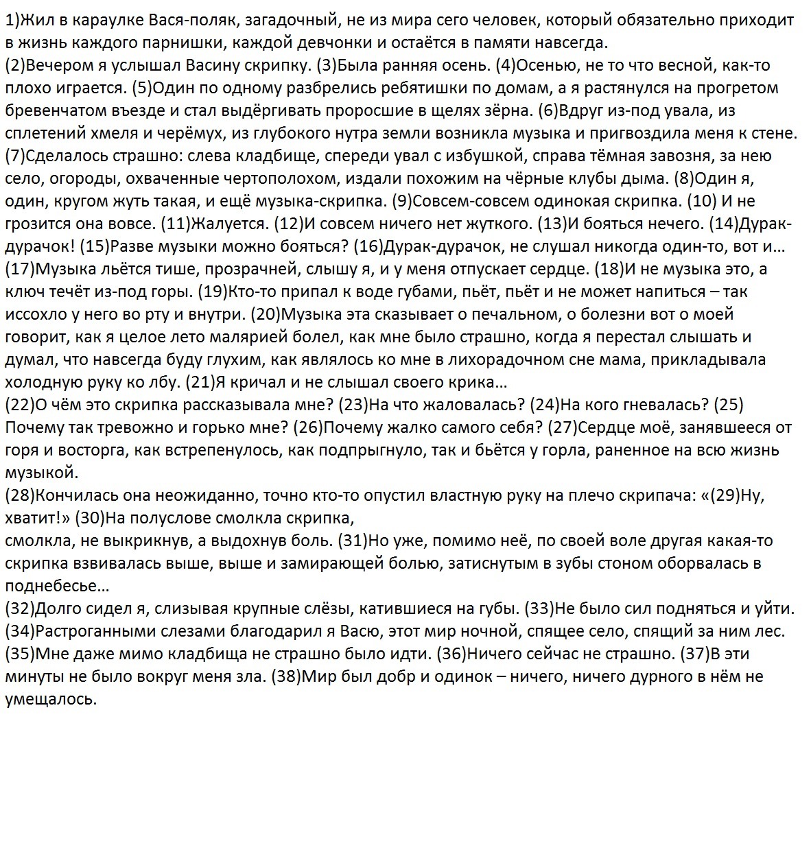 Сделалось страшно: слева кладбище,(1) спереди увал с избушкой,(2) справа тёмная завозня,(3) за нею село,(4) огороды,(5) охваченные чертополохом, издали похожим на чёрные клубы дыма. Один я,(6) один,(7) кругом жуть такая,(8) и ещё музыка-скрипка.